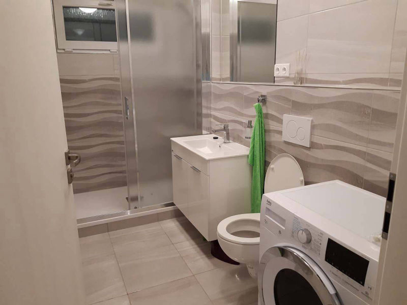 Koupelna v prvním patře nabízí prostorný sprchový kout, WC, umyvadlo se skříňkou a se zrcadlem, 2x žebříkový radiátor, pračku se sušičkou.